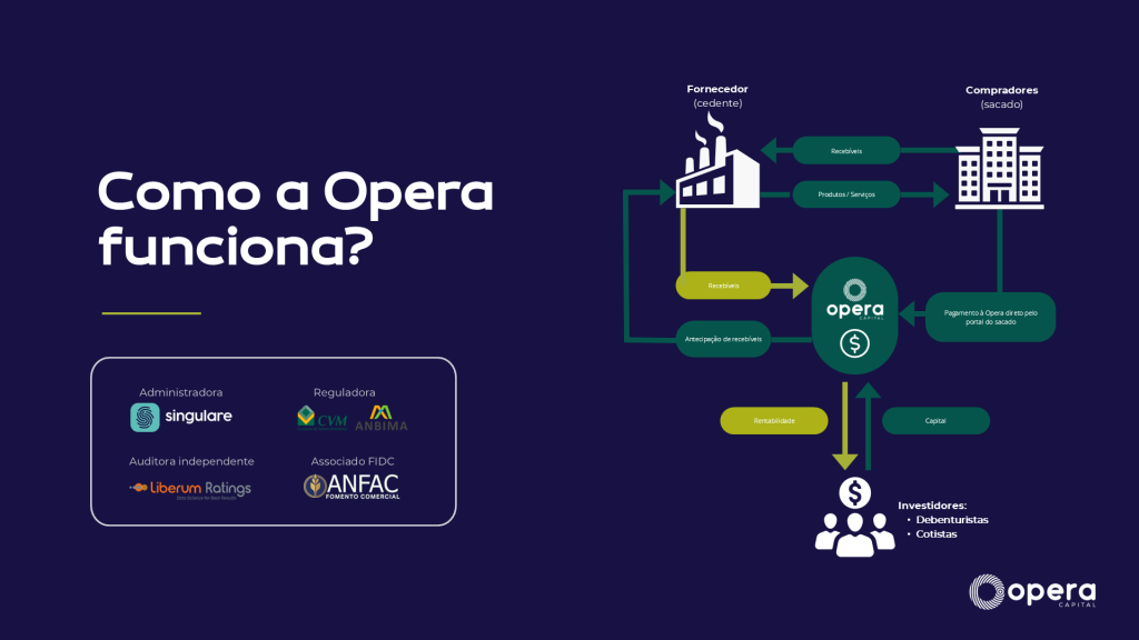 Com foco em crédito estruturado e antecipação de recebíveis, a Opera Capital viabiliza operações que transformam contas a receber em capital disponível, conectando empresas e investidores por meio de: